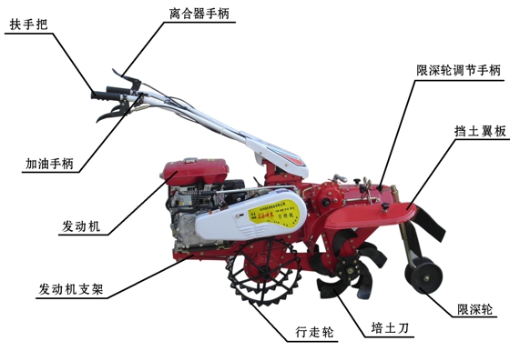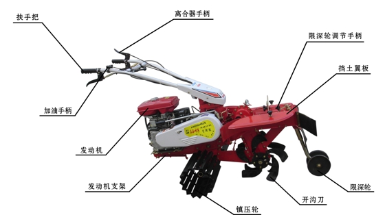 該機設計合理,結構緊湊,配有轉向離合器,扶手把高度4檔調整,左右360度任意旋轉,操作舒適方便,作業(yè)部件插銷連接,換裝方便快捷。主要用于大姜、大蔥、土豆等經濟作物種植開溝、培土和溫室大棚種植瓜果、蔬菜等作物旋耕、開溝等。